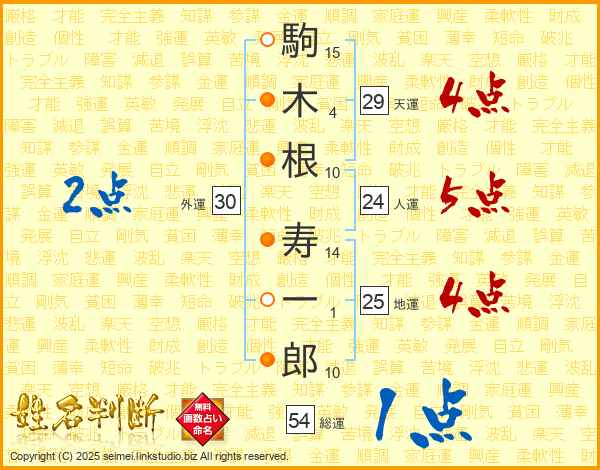 駒(15画)木(4画)根(10画) 寿(14画)一(1画)郎(10画)