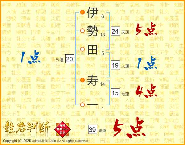 伊(6画)勢(13画)田(5画) 寿(14画)一(1画)