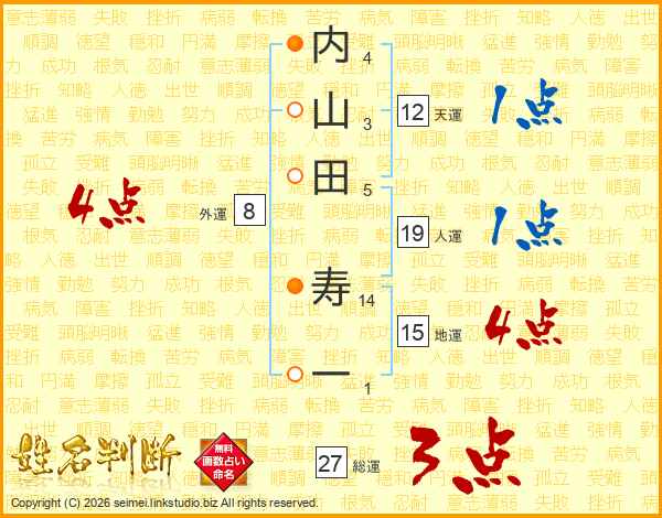 内(4画)山(3画)田(5画) 寿(14画)一(1画)