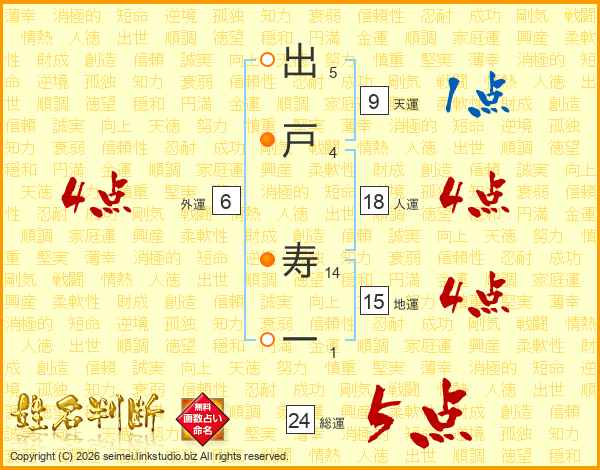 家系が持つ宿命的な運勢を表します。祖先から受け継いだ苗字ですので自分の力が及びません。家柄を象徴します。苗字の合計画数。