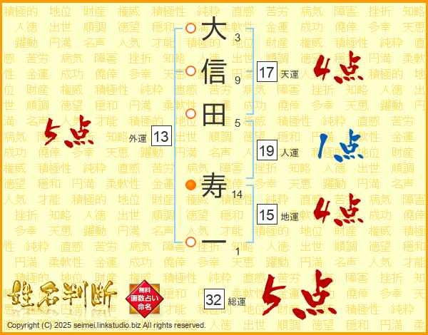 大(3画)信(9画)田(5画) 寿(14画)一(1画)