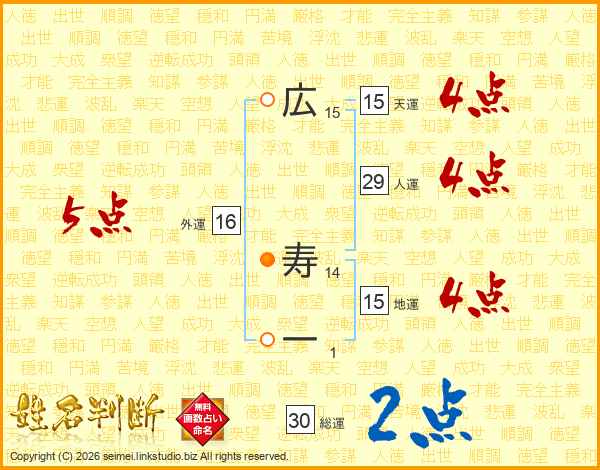 あなたの人生を表す1番重要な運勢です。生涯を通じて影響する総合運となり、主に50歳以降の晩年期に影響を及ぼします。苗字と名前の合計画数。