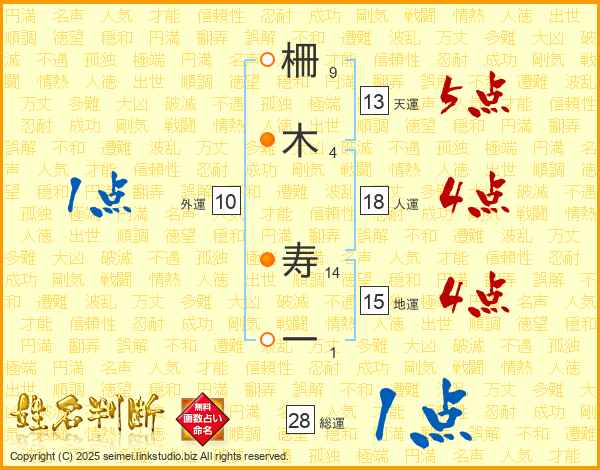 あなたの人生を表す1番重要な運勢です。生涯を通じて影響する総合運となり、主に50歳以降の晩年期に影響を及ぼします。苗字と名前の合計画数。