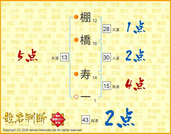 棚(12画)橋(16画) 寿(14画)一(1画)