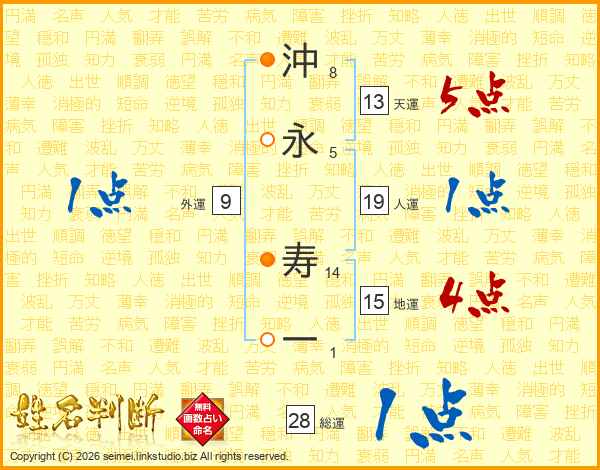 あなたの人生を表す1番重要な運勢です。生涯を通じて影響する総合運となり、主に50歳以降の晩年期に影響を及ぼします。苗字と名前の合計画数。