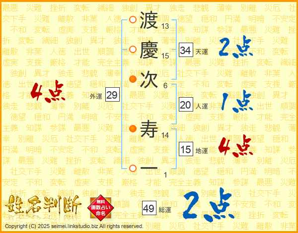 渡(13画)慶(15画)次(6画) 寿(14画)一(1画)