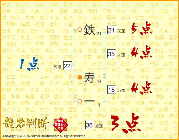 生活面を象徴する運勢です。外部から受ける影響力を表し、結婚運、家庭運や職場、環境への順応性を表します。総運から人運を引いた画数。姓や名が1文字の場合を除く。