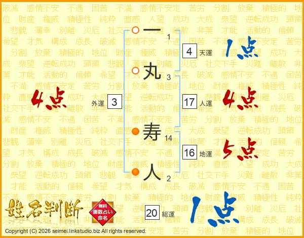 生活面を象徴する運勢です。外部から受ける影響力を表し、結婚運、家庭運や職場、環境への順応性を表します。総運から人運を引いた画数。姓や名が1文字の場合を除く。