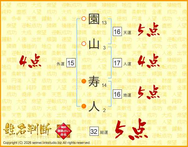 あなたの人生を表す1番重要な運勢です。生涯を通じて影響する総合運となり、主に50歳以降の晩年期に影響を及ぼします。苗字と名前の合計画数。