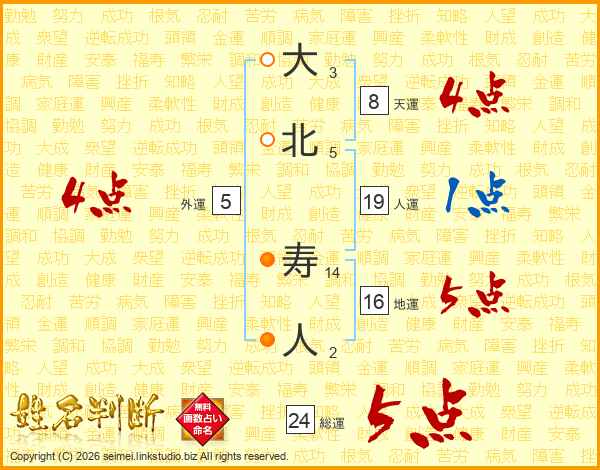 あなたの人生を表す1番重要な運勢です。生涯を通じて影響する総合運となり、主に50歳以降の晩年期に影響を及ぼします。苗字と名前の合計画数。