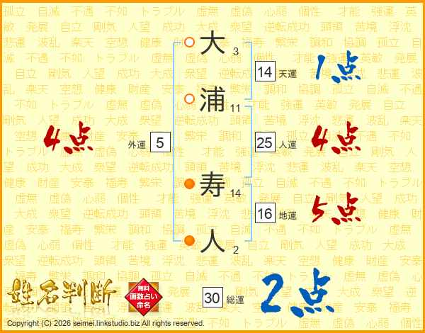 あなたの人生を表す1番重要な運勢です。生涯を通じて影響する総合運となり、主に50歳以降の晩年期に影響を及ぼします。苗字と名前の合計画数。