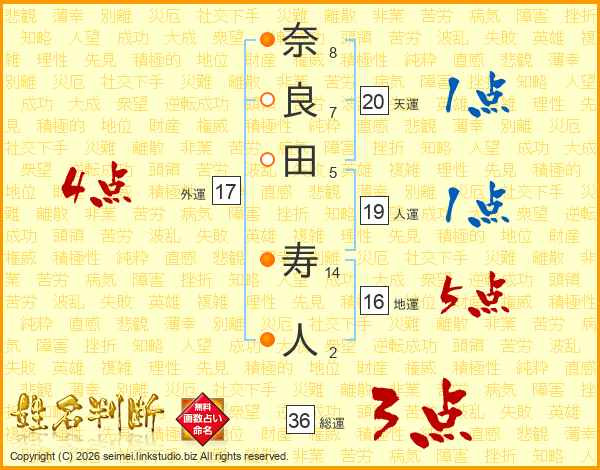 奈(8画)良(7画)田(5画) 寿(14画)人(2画)