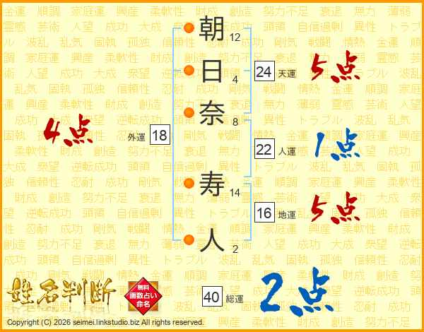 朝(12画)日(4画)奈(8画) 寿(14画)人(2画)