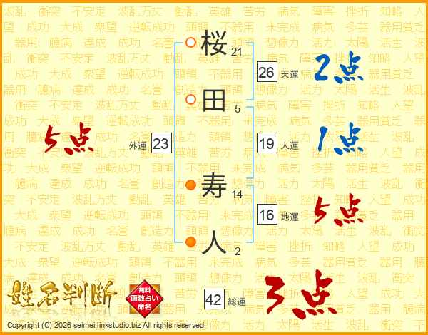 桜(21画)田(5画) 寿(14画)人(2画)