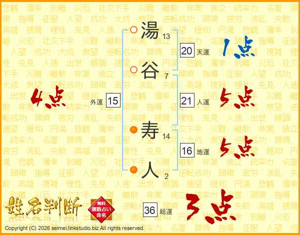 湯(13画)谷(7画) 寿(14画)人(2画)