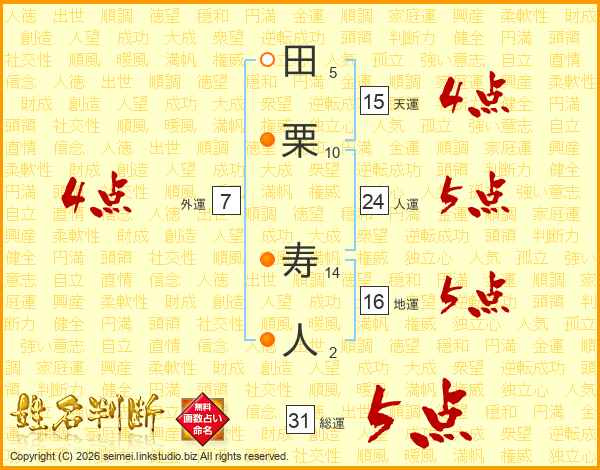 生活面を象徴する運勢です。外部から受ける影響力を表し、結婚運、家庭運や職場、環境への順応性を表します。総運から人運を引いた画数。姓や名が1文字の場合を除く。
