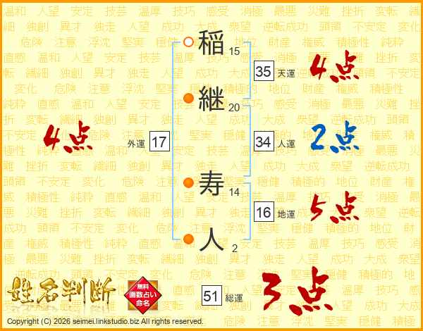 あなたの人生を表す1番重要な運勢です。生涯を通じて影響する総合運となり、主に50歳以降の晩年期に影響を及ぼします。苗字と名前の合計画数。