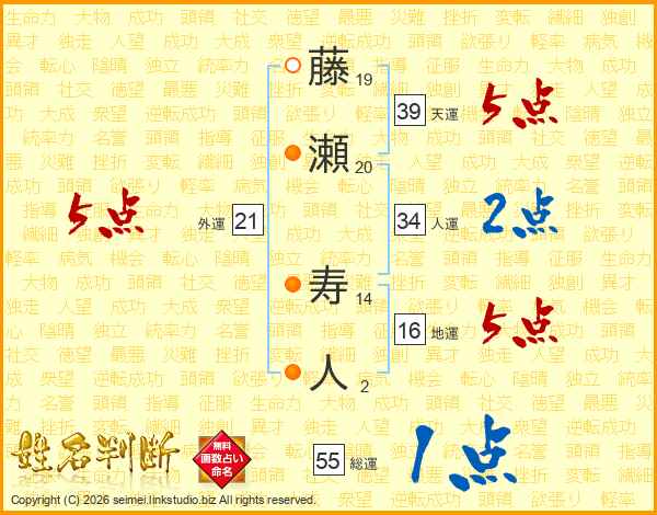 藤瀬寿人さんの総運は55画の1点!