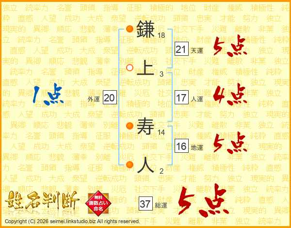 あなたの人生を表す1番重要な運勢です。生涯を通じて影響する総合運となり、主に50歳以降の晩年期に影響を及ぼします。苗字と名前の合計画数。
