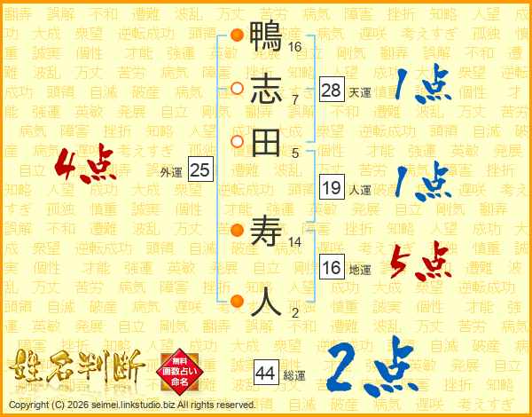 鴨志田寿人さんの総運は44画の2点!