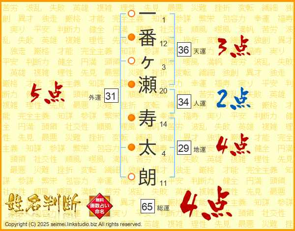 一番ヶ瀬寿太朗さんの総運は65画の4点!
