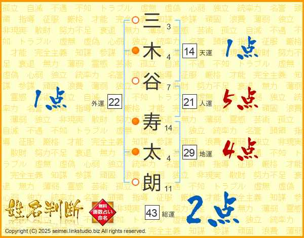 三(3画)木(4画)谷(7画) 寿(14画)太(4画)朗(11画)