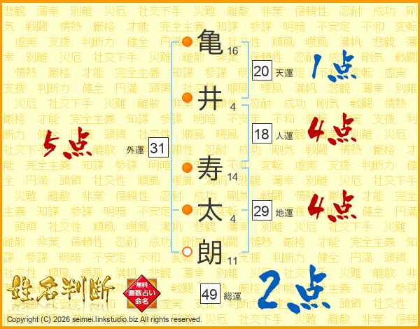 亀(16画)井(4画) 寿(14画)太(4画)朗(11画)