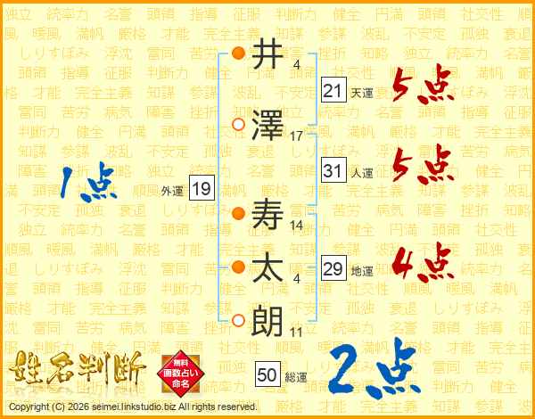 井(4画)澤(17画) 寿(14画)太(4画)朗(11画)