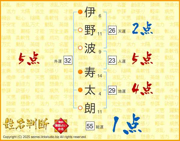 伊(6画)野(11画)波(9画) 寿(14画)太(4画)朗(11画)