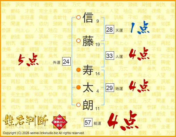信(9画)藤(19画) 寿(14画)太(4画)朗(11画)