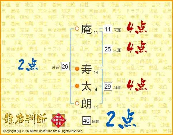 庵(11画) 寿(14画)太(4画)朗(11画)