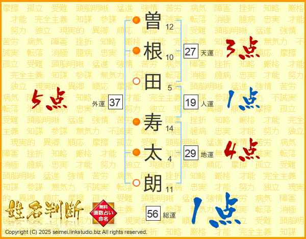 曽(12画)根(10画)田(5画) 寿(14画)太(4画)朗(11画)
