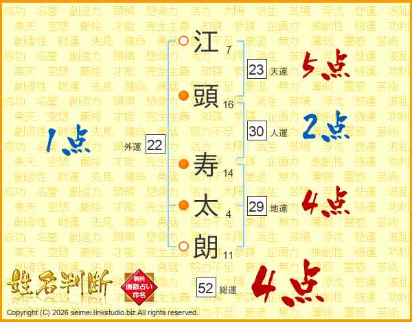 江(7画)頭(16画) 寿(14画)太(4画)朗(11画)