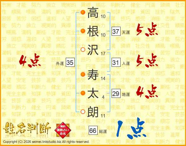 高(10画)根(10画)沢(17画) 寿(14画)太(4画)朗(11画)
