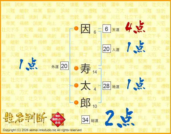 因(6画) 寿(14画)太(4画)郎(10画)