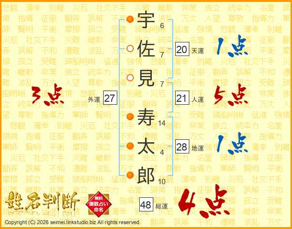 宇(6画)佐(7画)見(7画) 寿(14画)太(4画)郎(10画)