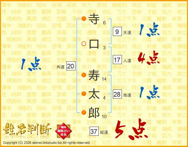 寺(6画)口(3画) 寿(14画)太(4画)郎(10画)