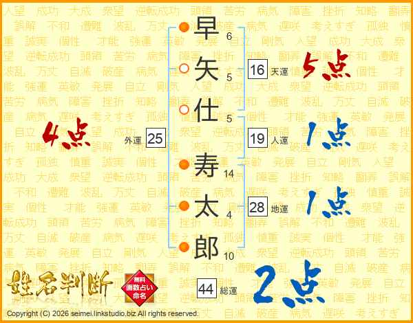 早(6画)矢(5画)仕(5画) 寿(14画)太(4画)郎(10画)