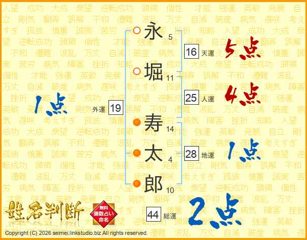 永(5画)堀(11画) 寿(14画)太(4画)郎(10画)