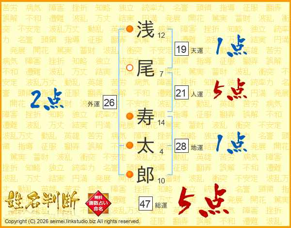 浅(12画)尾(7画) 寿(14画)太(4画)郎(10画)