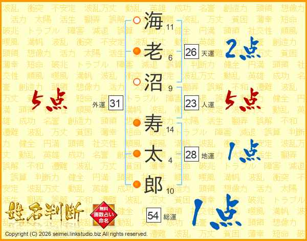 海(11画)老(6画)沼(9画) 寿(14画)太(4画)郎(10画)