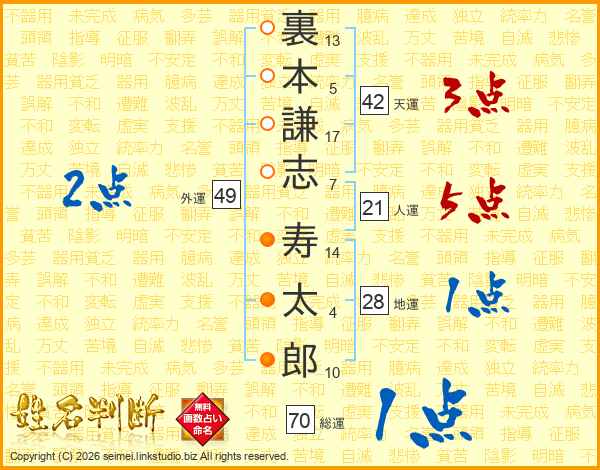 裏(13画)本(5画)謙(17画)志(7画) 寿(14画)太(4画)郎(10画)