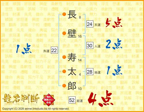 長(8画)壁(16画) 寿(14画)太(4画)郎(10画)