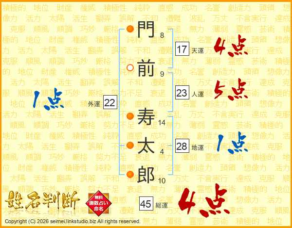 門(8画)前(9画) 寿(14画)太(4画)郎(10画)