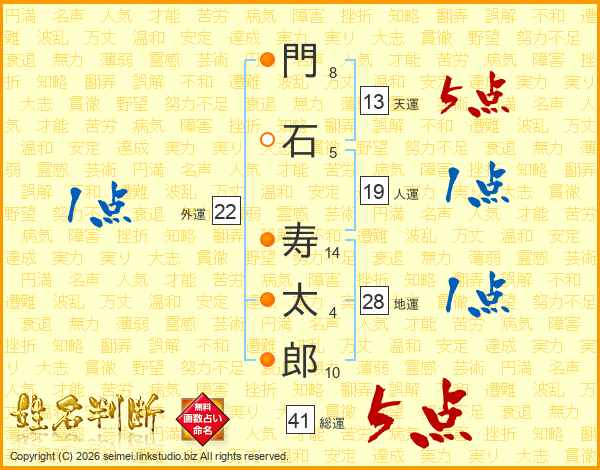門(8画)石(5画) 寿(14画)太(4画)郎(10画)