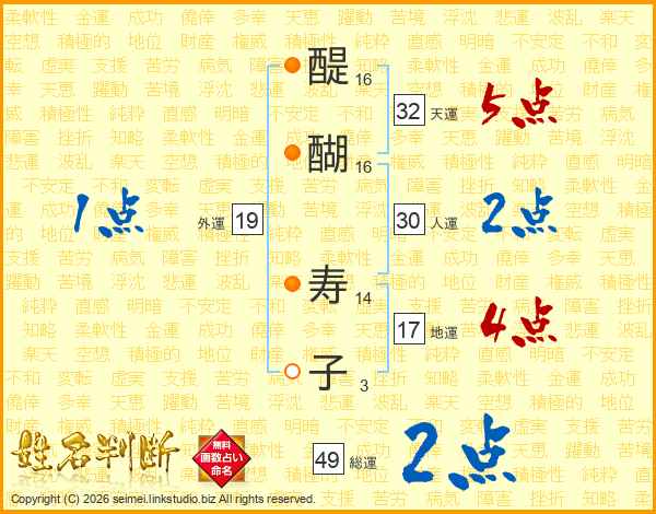 醍(16画)醐(16画) 寿(14画)子(3画)