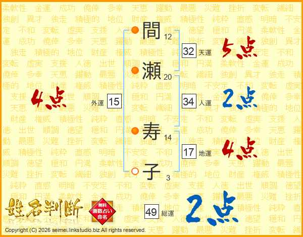 間(12画)瀬(20画) 寿(14画)子(3画)