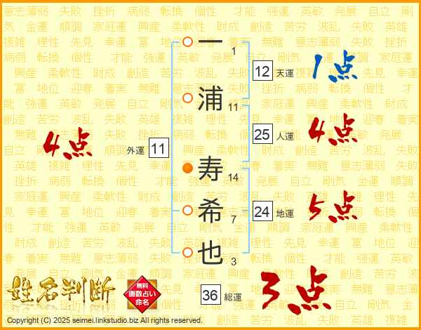 一(1画)浦(11画) 寿(14画)希(7画)也(3画)
