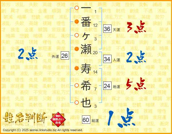 一番ヶ瀬寿希也さんの総運は60画の1点!