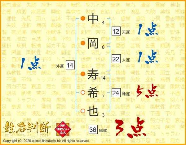 中(4画)岡(8画) 寿(14画)希(7画)也(3画)